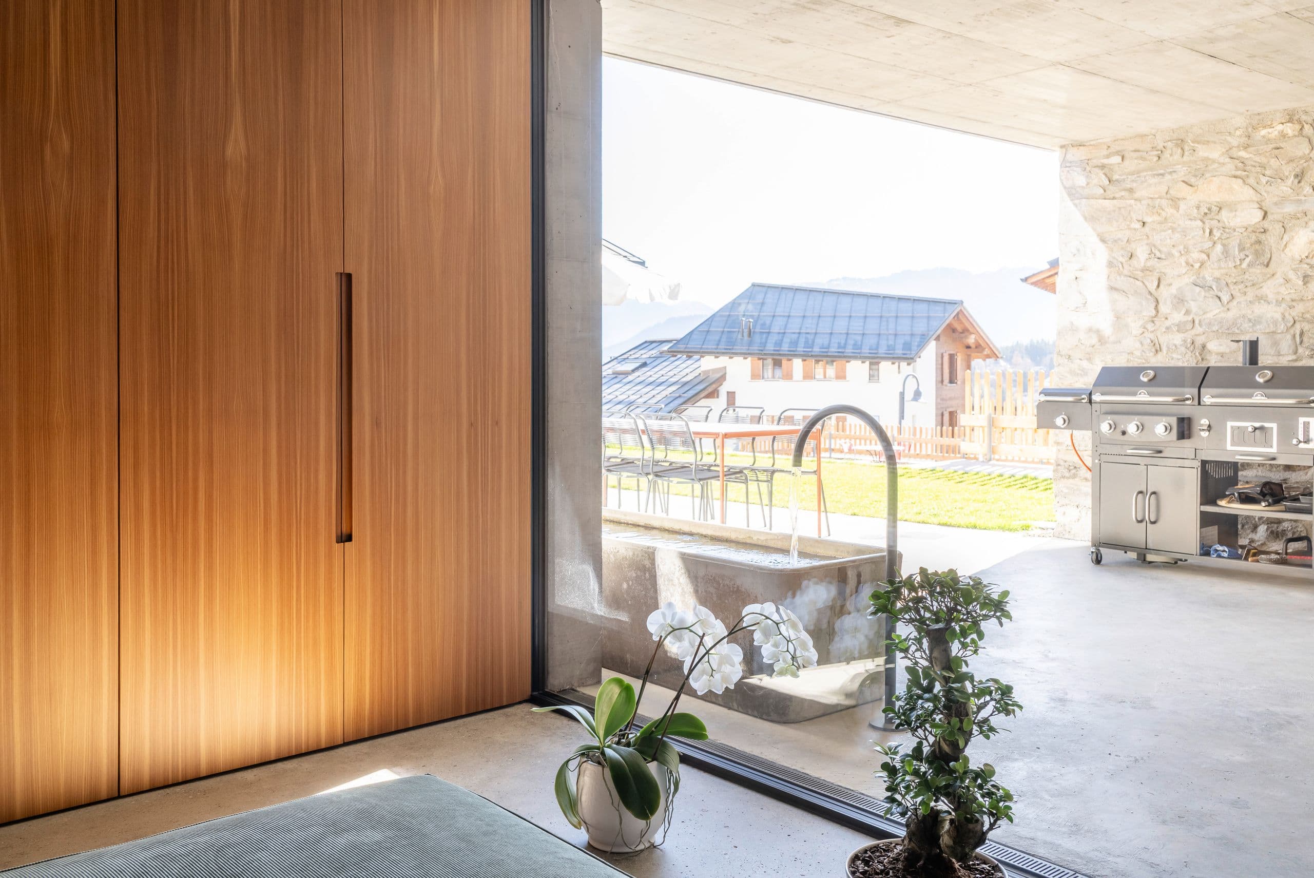 Im historischen Dorfkern von Flims galt es, ein anspruchsvolles Ensemble zu vervollständigen: Ein Wohnhaus aus dem 17. Jahrhundert, ein Stall von 1826 und ein moderner Neubaukörper mussten zu einer architektonischen Einheit verschmolzen werden. Die Herausforderung der Fensterplanung lag im Umgang mit der historischen Substanz bei gleichzeitigem Wunsch nach grosszügigen Wohngefühl. Im Zentrum stand das Zusammenspiel der rahmenlosen Verglasungen und Schiebeelemente mit dem bestehenden Hausteil und dem modernen Neubau.