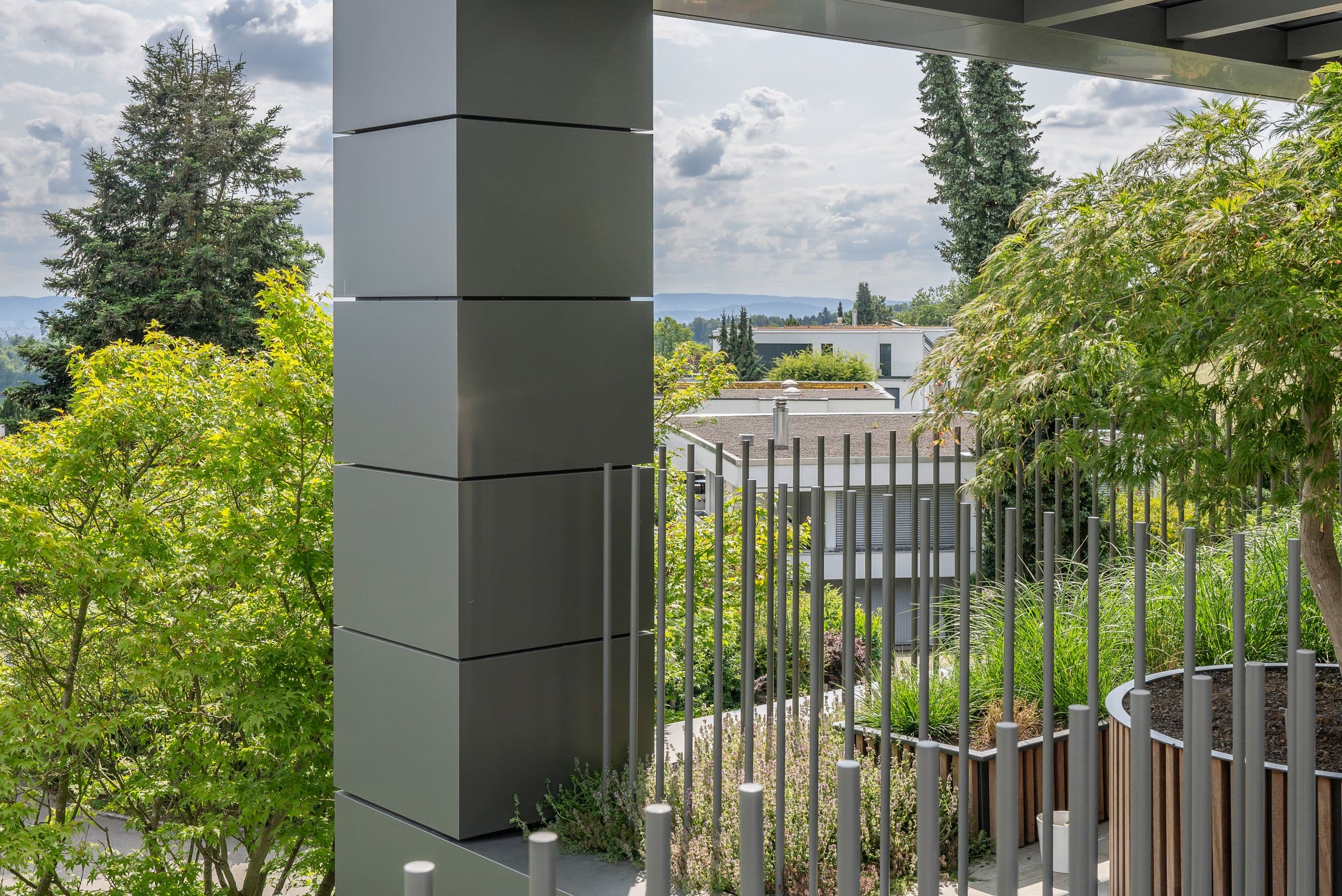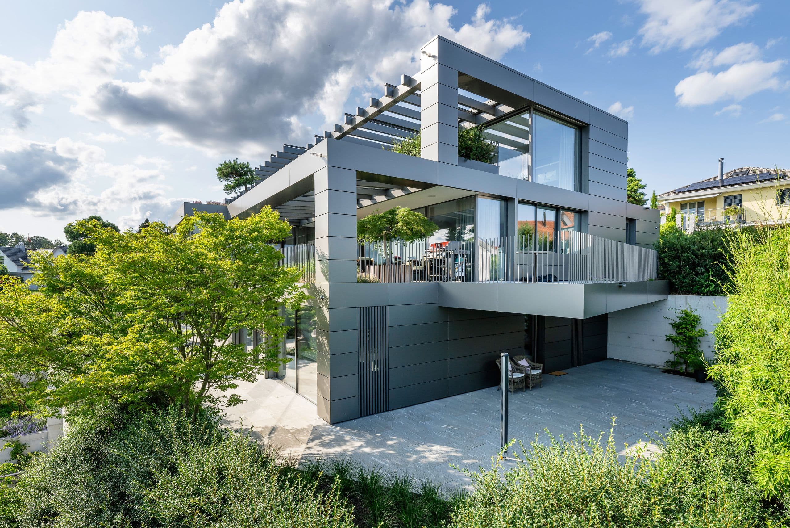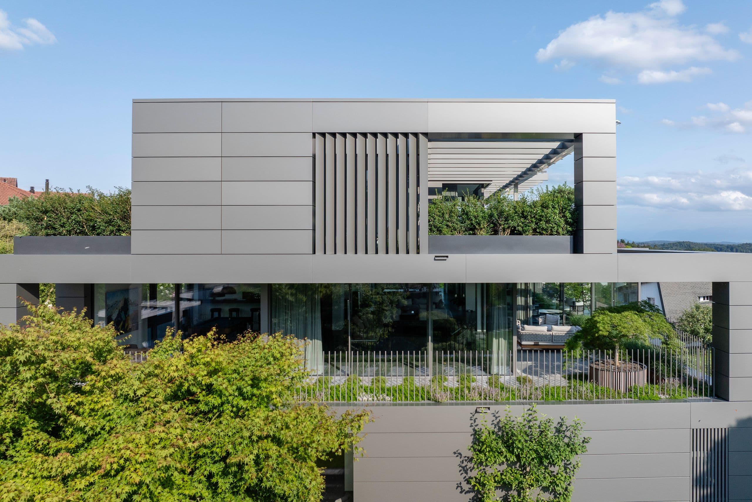 Entwicklung und Umsetzung einer Fassade, verschiedener Geländer und eines Garagentores in Spezialanfertigungen, die den hohen Ansprüchen des Architekten und der Bauherrschaft entsprechen.