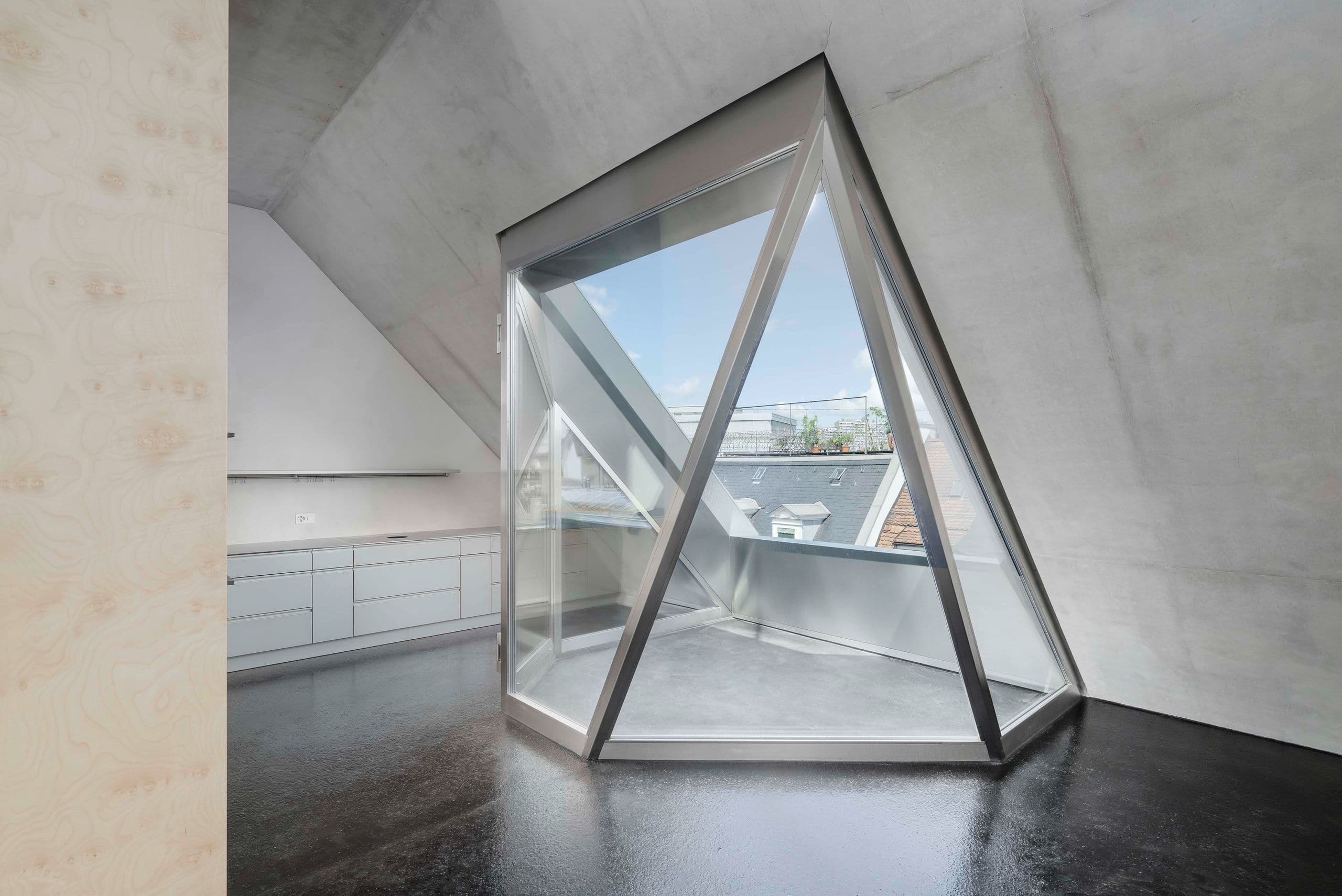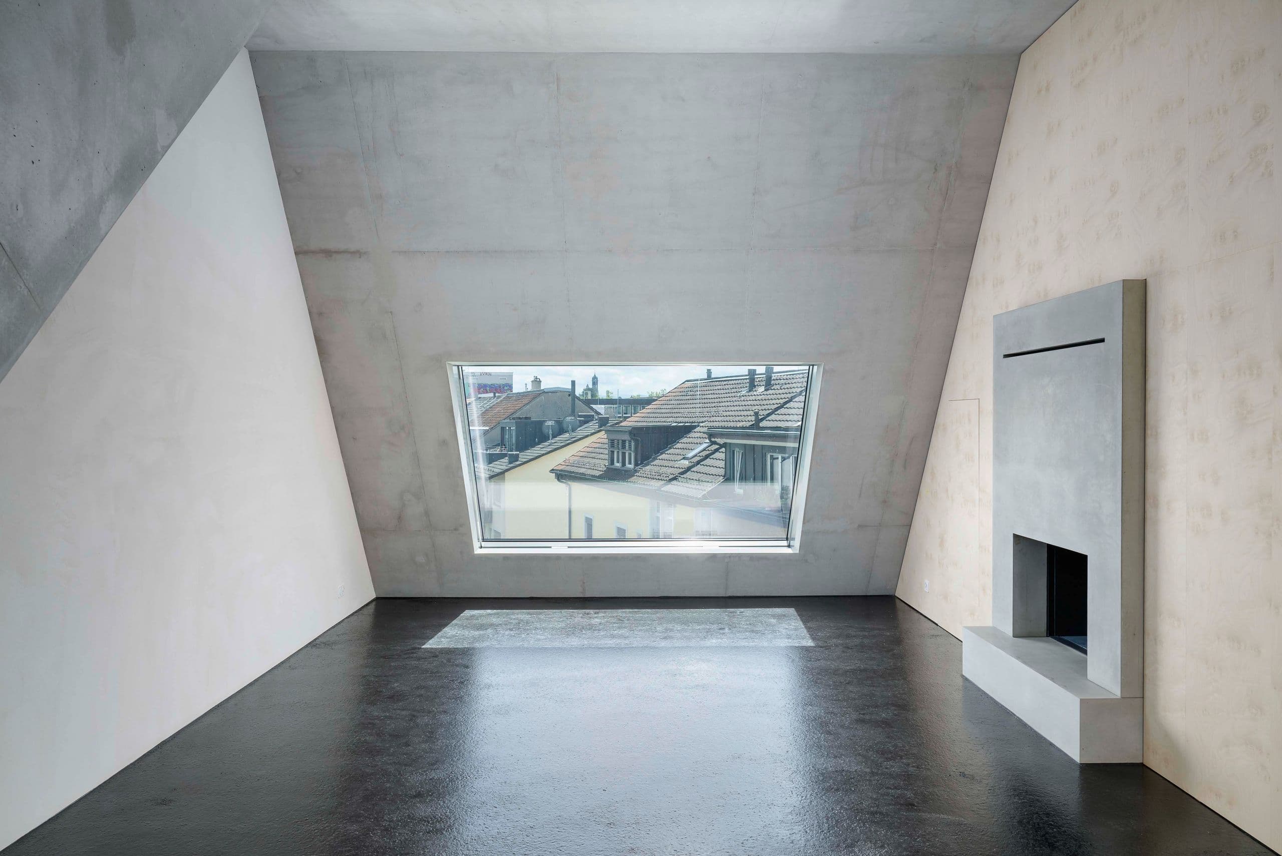 Das verwinkelte Raumlayout in Kombination mit viel Sichtbeton verschafft der exklusiven Wohnung ein hochmodernes Wohnambiente. Gefragt waren Fenster, die sich nahtlos in die spektakuläre Architektur einfügen.